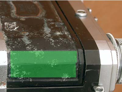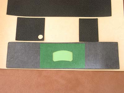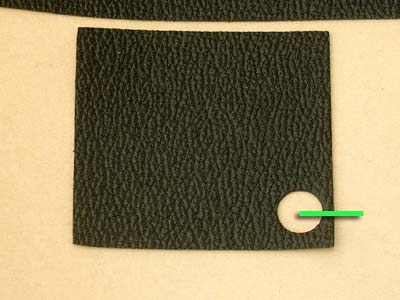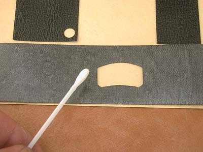 11. 裏蓋部分の革を台紙から剥がして裏返し、接着面を露出させてください。そして、上の写真にある緑の網掛け部分にアルコール(推奨)、もしくは水を塗ります。 アルコールか水が乾く前でしたら接着力が一時的に落ちますので、位置決めがしやすくなります。 |